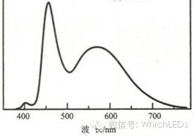 这是目前LED行业最为主流的白光产生原理。这种原理形成的白光如果荧光粉涂覆的不均匀,容易造成黄色和白色的光圈现象。在光谱图上看,有两个波峰,一个是蓝色一个是黄绿色波峰。在制作不同色温情况下,光谱会有不同。并且同色温不同显色指数的情况下,光谱也会不同,取决于荧光粉材料的受激发波长和激发波长。
