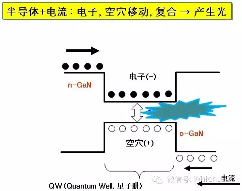LED是当正向电流沿半导体PN节方向流过时将电子与空穴注入发光层内,当电子和空穴发生复合时有一部分能量以光的形式输出的电子元件(另一部分以热的形式输出)。通过施加高于PN节扩散点位的电压,将电子注入P型半导体,空穴注入N型半导体。LED发光的光线是从内部向表面、背面和各个截面所有方向发出。LED发出的光为单色光,光的带宽很窄,发光波长取决于制作的材料。(中村修二之前LED已经被发明了红色、黄色,单由于缺少了蓝色所以一直未能被照明产品采用,中村修二通过使用GaN材料生长工艺而得到蓝光,并一直致力于提高蓝光的输出光功率)。