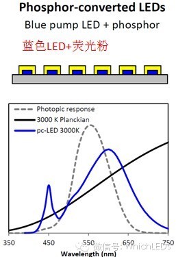 通过蓝色的LED激发黄绿色荧光粉产生580nm左右的黄绿光,再和蓝光混合形成白光。