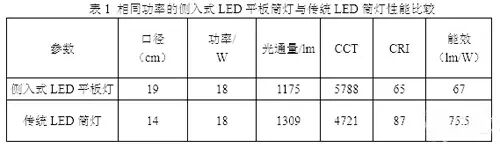 第一,能效不容易做得很高。表 1 给出了相同功率的侧入式 LED 平板筒灯与传统 LED 筒灯性能的一个比较。从分析上可以看出,相同功率下侧入式 LED 平板灯在光输出、能效及显色指数(CRI)等性能指标上与传统 LED 筒灯相比仍有不小的差距。