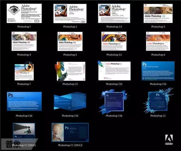 下面是 Adobe 公司到目前为止 Photoshop 各个版本的完整时间表,看看你是从哪一版开始用起的呢?值得一提的是,虽然今年是25周年,但是其实从1988年就已经有PS了,那时还不属于 Adobe 公司。后来才卖给 Adobe 公司,而在1990年 Adobe 公司发布 Photoshop 1.0.7。