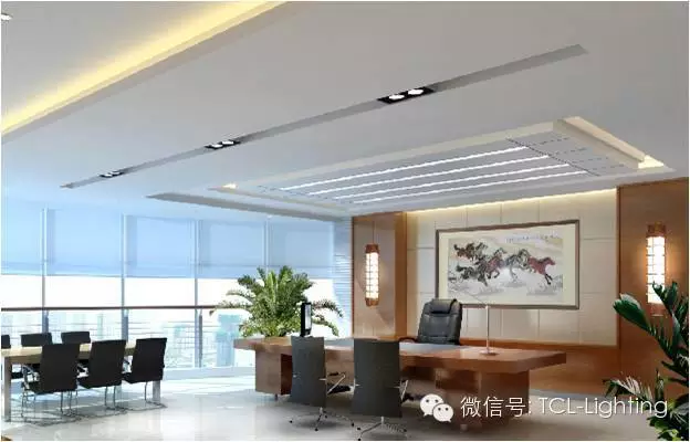 单人办公室一般属有一定级别的领导使用,用途包含了常规的工作与会客,也有小型的培训及会议。照明应以功能性为主,并结合空间装饰增加氛围营造。通常工作台区域可采用漫射格栅灯盘或防眩系列筒灯。同时可采用防眩天花射灯加强墙的立面照明,提高舒适度,营造优良的办公环境。
