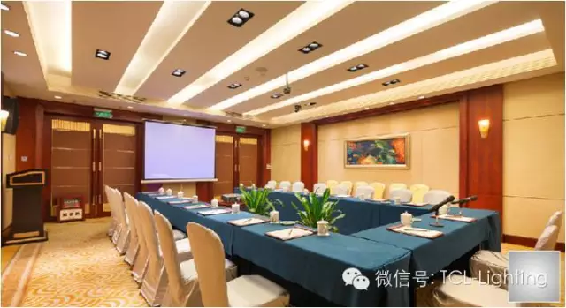 同时,与会者面部表情的传达也是会议室照明中最主要的任务,照明应该避免不合适的阴影和明暗对比。可以采用射灯对墙立面进行洗墙照明,为单调的长时间会议环境提供富于趣味的环境光。结合天花装饰结构,可采用悬吊式灯具或隐藏式灯具形成灯带。小会议室要加强光影效果,避免小空间带来的压抑感,可以采用上下都可出光的间接照明灯具,均匀照亮天花和墙壁。