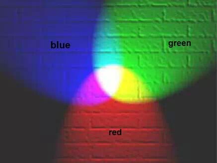 把红光、绿光、蓝光投射在一起,也可以混合成白光,如下图所示,人造照明光源就是根据这个原理合成白光的,实际上,白光除了红光、绿光、蓝光之外,还需要包含其他成分的单色光,这样,混合的白光才会对被照明的物体提供真实的色彩还原,我们称之为白光的显色性能。