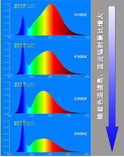 对白光的成分分析采用的是光谱分析法,白光的光谱分析是把白光的各种单色光的成分用波长与波长对应的辐射功率组成的二维图表示,下图是不同色温的 LED 白光光谱图,从图中可以直观的看出,色温越高,蓝光量比越大。