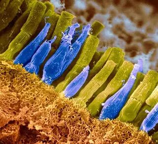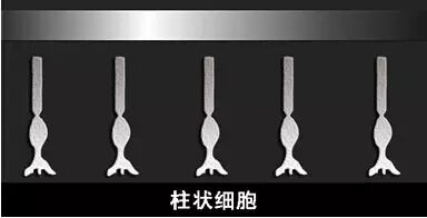 图中黄绿色的条形细胞称为柱状细胞,图中蓝色圆锥状的细胞称为锥状细胞,这两种细胞构成人眼的视觉细胞,锥状细胞主要分布在黄斑中央凹处,人眼看到的物体就是通过这两种细胞对光的感应实现的,柱状细胞与锥状细胞把感应到的光信号传递至神经细胞进行混合,再由神经纤维传递到大脑,形成视觉图像。