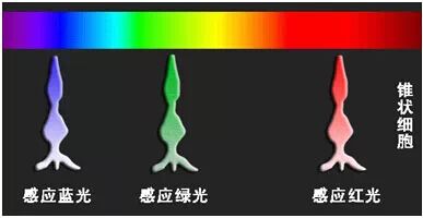 锥状细胞又分为3种,分别是感应红光的锥状细胞、感应绿光的锥状细胞和感应蓝光的锥状细胞,如下图所示: