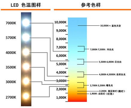 衡量白光光色的指标是色温,单位是K(开尔文),通常,LED 照明白光的色温范围是:2700K-7000K,把白光中的蓝光成分提高,白光的色温就提高,把白光中的蓝光成分降低并且把红光成分提高,白光的色温就降低,人造光源的色温与其他光源近似的关系如下图: