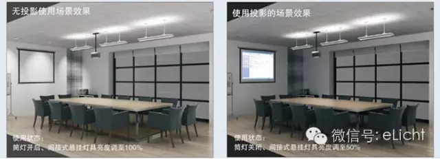 图:使用可调光的半间接照明灯具,可以满足多媒体会议室的照明需求,实现不同的照明场景。