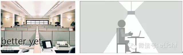 图:许多照明灯具被设计成防止人们在“正常”视角(眼睛正上方)内直接看到光源,但是灯具(筒灯、格栅灯盘)中的光源外露仍然产生了眩光妨碍了办公。