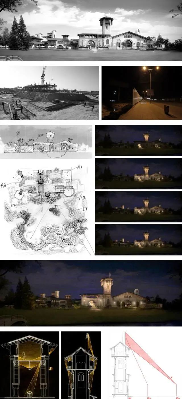 现场调研和环境分析,视点-视线-对象分析,现场光环境数据采集,设计概念(设计的出发点)和表达,基本的照明方式表达,必要的定量分析。