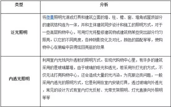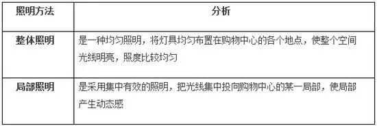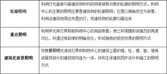 在现代购物中心的夜景照明设计中广泛采用的是混合照明方式,把整体照明与局部照明有机结合起来,在整体照明的基础上加强局部照明,使购物中心环境产生千变万化、生动活泼的效果。