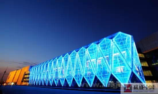 照明是为了体现建筑的特点,购物中心照明设计中表现建筑形体及肌理;如山东潍坊万达广场夜景照明设计。万达广场在体现建筑形体的同时,融入不规则变化,强调建筑横向如银河般的梦幻变化,使整体建筑群体充满青春、时尚的气息。立面黄色铝条采用 LED 大功率洗墙,突出建筑的层次和不同肌理。