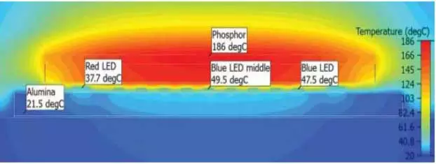 图5是该文根据试验数据并结合仿真得出的,从图中可以看到,荧光胶的温度可达186℃,但芯片温度只有49.5℃。芯片的温度较低是因为芯片直接贴装到铝基板上方,芯片的热量可通过基板快速传递到散热器上,因此COB光源的芯片温度远低于芯片允许的最高结温。