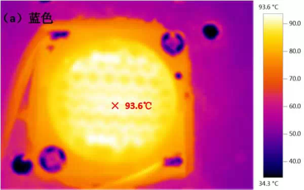 本次待测样品除了荧光胶的配比不同,其他材料均相同,待测样品的颜色分别为蓝色、2700K和6500K。三款样品的红外热成像结果参见图3(a)、(b)和(c)。