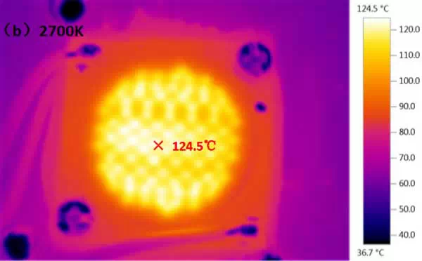 从上节的测温实例中可知,COB 光源的胶体温度最高可达125℃,而目前大部分芯片能承受的最高结温不能超过125℃,很多灯具厂商认为发光面的温度超过125℃,芯片的温度应该会更高,继而担忧COB光源的可靠性。