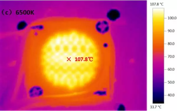 从图中可以看到,蓝色样品的发光面最高温度为93.6℃,2700K的发光面最高温度为124.5℃、6500K的发光面最高温度为107.8℃。
