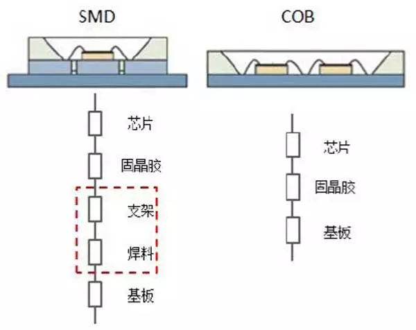 COB封装就是将芯片直接贴装到光源的基板上,使用时COB光源与热沉直接相连,无需进行SMT表面组装。SMD封装则先将芯片贴装在支架上成为一个器件,使用时需将器件贴装到基板上再与热沉连接。两者的热阻结构示意图如图1所示,相对于SMD器件,COB热阻比SMD在使用时少了支架层热阻与焊料层热阻,芯片的热量更容易传递到热沉。