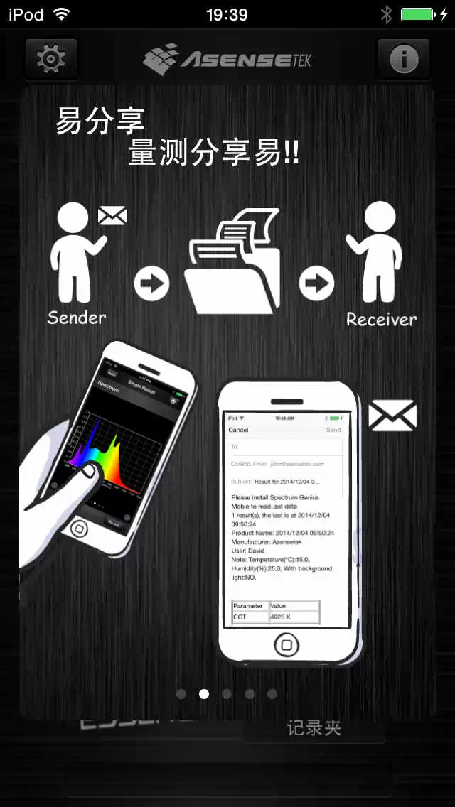 图:数据可以通过email、smart pass、USB(ios、Android)、SD card(Android)等方式及时分享发送给任何人。
