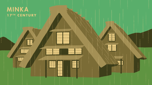 民家是日本山地居民常用的民居式建筑,高耸的坡屋顶对缓解积雪起了很大的作用。