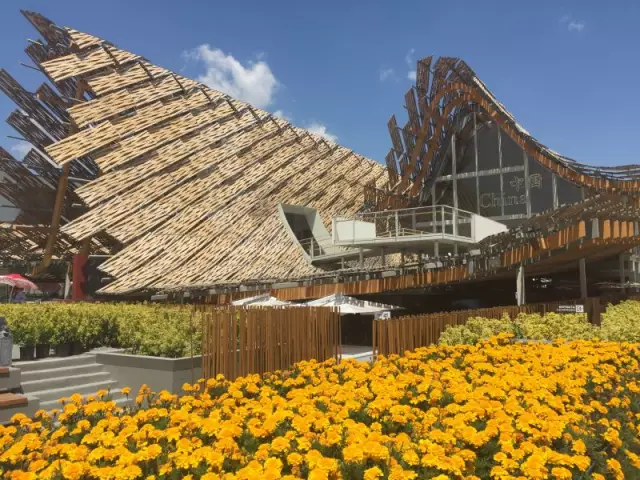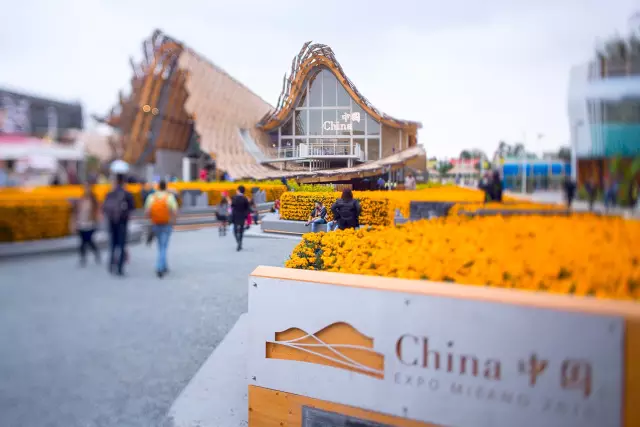 中国馆用地面积4590㎡,主题为“希望的大地”,外观采用“风吹麦浪”创意造型,馆内用大量篇幅展示了与农耕、饮食和人居相关的中国传统文化和技术,例如瓷器、蜀绣、古琴、京剧脸谱、凉茶、油纸伞、烤鸭等等。回应了本届世博会的主题,同时也展现了具有中国特色的乡土人情。