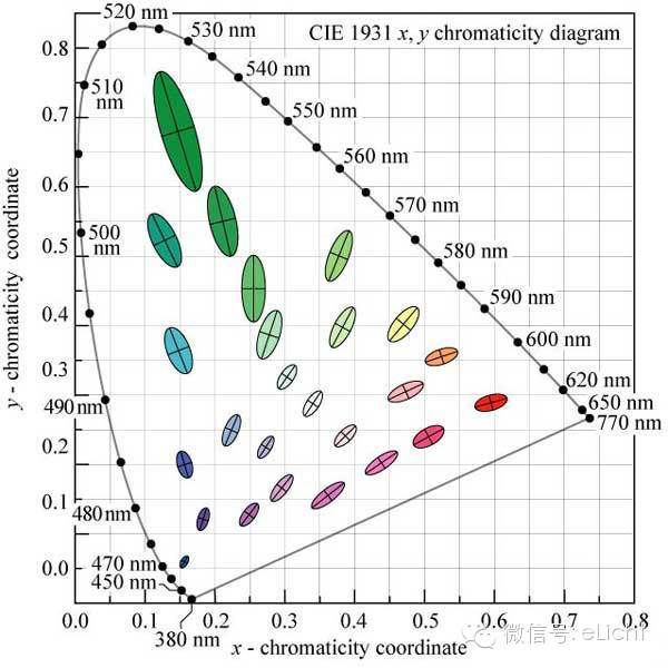 如果两个色坐标落在1阶麦克亚当椭圆之内,则人眼几乎是看不出两者是有什么区别的。3阶麦克亚当椭圆边界对应的颜色与中心颜色的差别才是人眼恰可察觉的色差值。