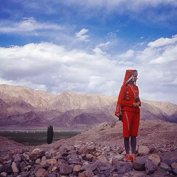 塔什库尔干,塔吉克新娘婚后要穿整整一年的红衣,戴红色库勒塔和红纱。她站在石头城上等爱人放牧回来。