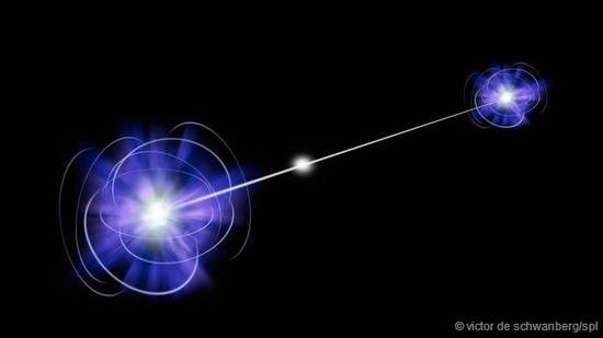 神秘的纠缠粒子。成对的纠缠粒子之间,任一成员粒子的状态发生改变都会立即引起另一个粒子的相应变化,这种影响不受时间与距离限制。