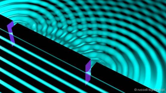 当光线通过狭缝时,其表现出来的行为与水波穿过狭窄开口时表现出的性质基本一致:它会发生衍射并形成半球状传播的波。