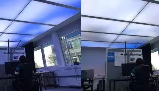 有研究报告显示,在日光下工作,可以提高15%的生产力,所以 Fraunhofer Institute for Industrial Engineering IAO 特别研发出 LED 虚拟天空面板,以 LED 灯泡模拟自然天空和日照,取代传统办公室的天花板,藉此营造快乐的工作环境,提高员工的生产效率,而且 LED 灯泡的节能效果比传统白热灯泡高出八倍,为企业达到节省电费和提高工作效率的双赢效果。