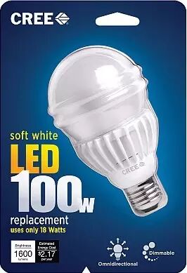 所以只要 LED 球泡灯所发出的流明数和某种白炽灯的流明数相当,那么这个球泡灯就可以取代这种白炽灯。这是老百姓最容易接受的一种方法。所以现在美国、日本的球泡灯的包装盒上都用很大的字标明可以取代多少瓦的白炽灯,这个数字虽然也用 W 作单位,但是它并不是 LED 所消耗的瓦数,而是可以取代的白炽灯的瓦数,但是老百姓一看就明白(见下图的 Cree 公司的球泡灯包装盒,其中 100W 就是可取代的白炽灯瓦数,而不是 LED 瓦数)。