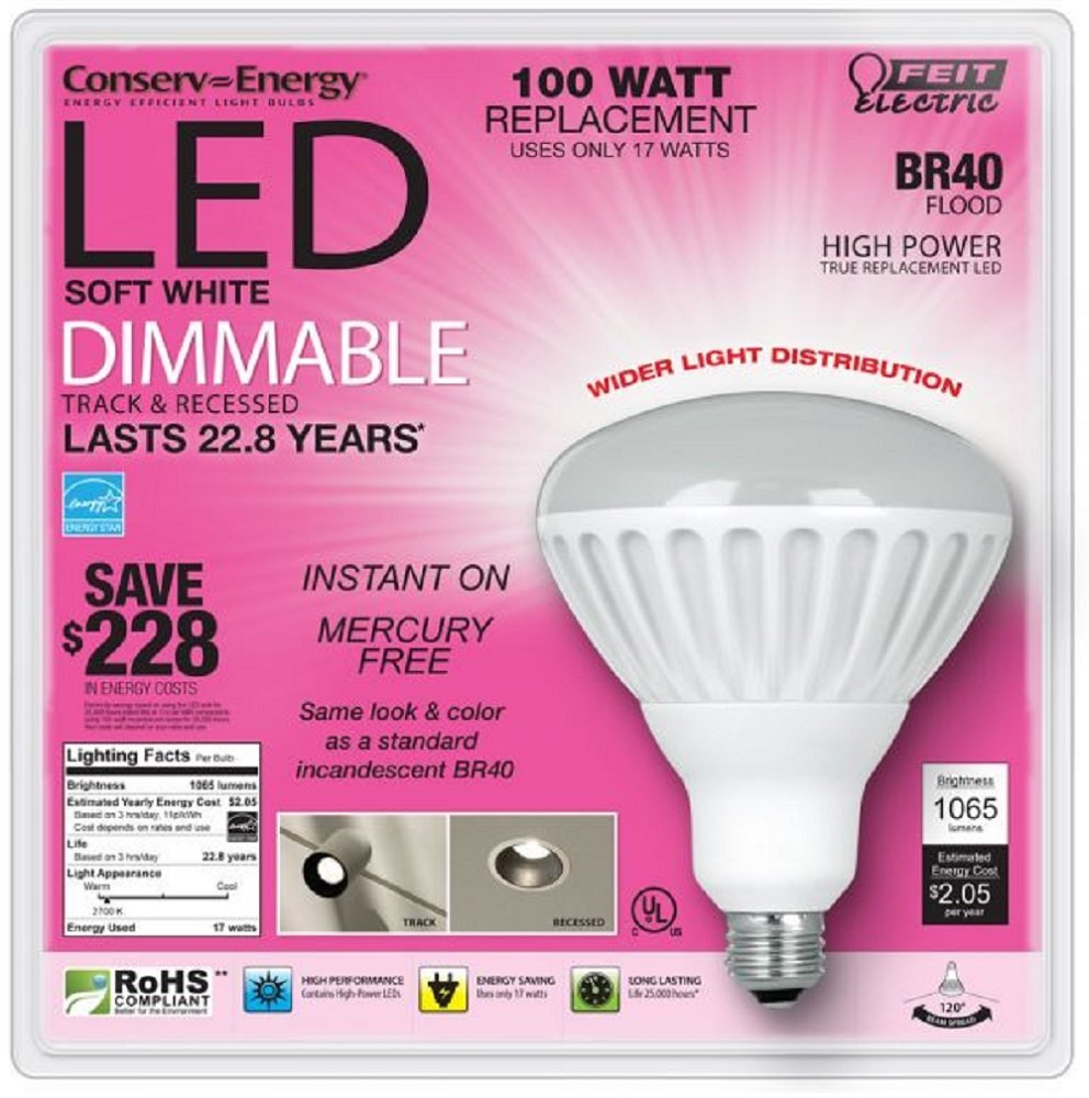 这是一个 FEIT \nElectric 的 17W 球泡灯。它可以用来取代 100W 的白炽灯,而每年的电费为17 x 3 x 365 x 0.11/1000=$2.05,白炽灯的电费为100 x 3 x 365 x 0.11/1000 \n=$12.05,所以每年节约的电费为$10美元。22.8年总共节约了$228美元。