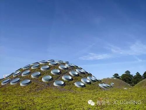 ▲这是一个老博物馆扩建比赛,设计师把新馆藏到老博物馆的草坪底下去了。白天可以把日光引进地下,而且可以智能地增强或减弱自然光来维持展厅照度的稳定。