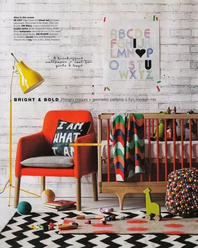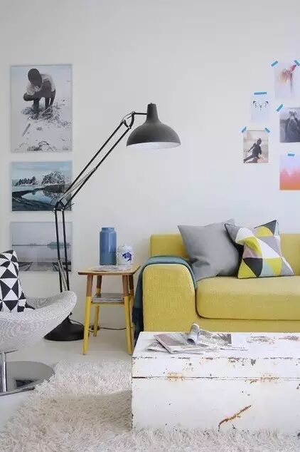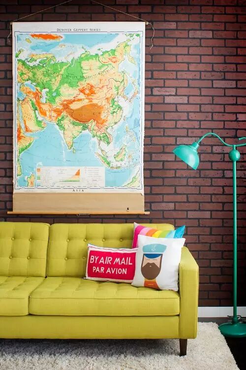 搭配鹅黄色沙发和红砖背景