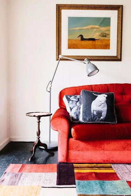 与红色沙发、多色格子地毯搭配